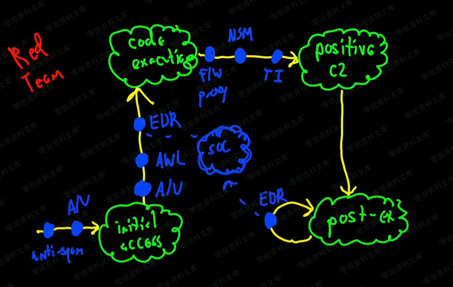 在一个红队的典型渗透过程中,一般来说按照顺序有四个目标,分别是:初始访问、代码执行、获取权限、后渗透。