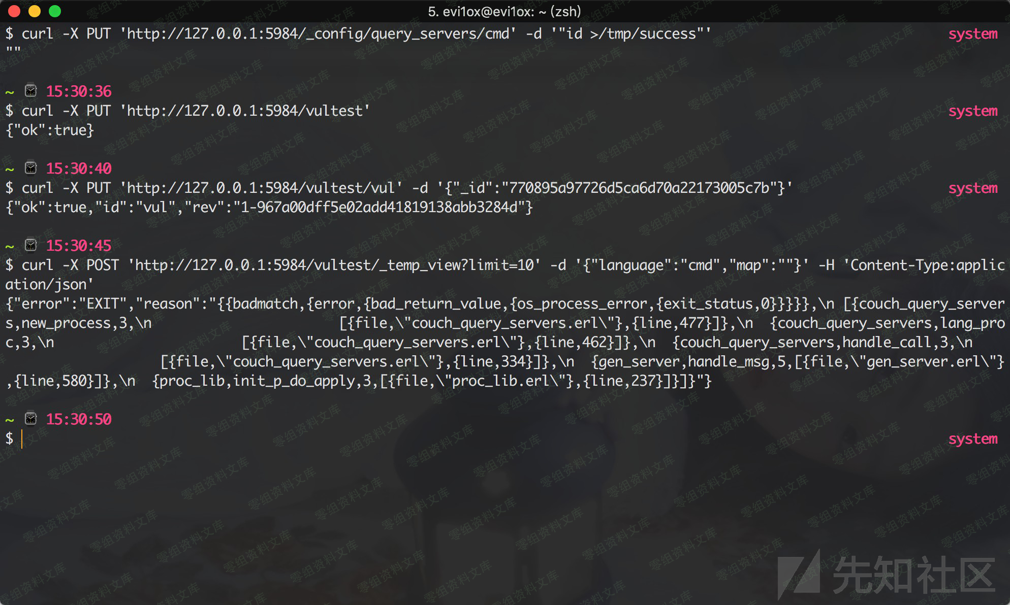 第一个请求是添加一个名字为cmd的query_servers,其值为 id >/tmp/success,这就是我们后面待执行的命令。 第二、三个请求是添加一个Database和Document,这里添加了后面才能查询。 第四个请求就是在这个Database里进行查询,因为我将language设置为cmd,这里就会用到我第一步里添加的名为cmd的query_servers,最后触发命令执行。