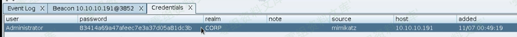 • 使用dcsync来提取用户哈希,可以在Credentials面板上看到提取到的hash