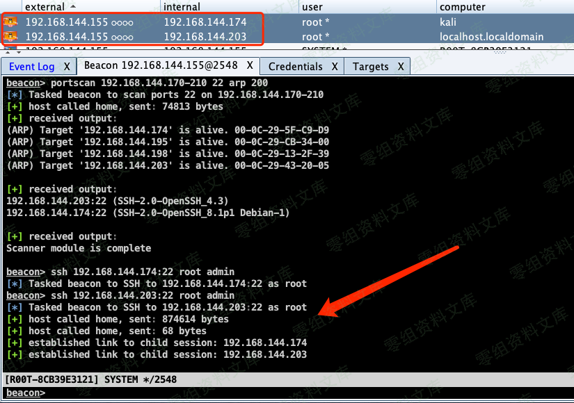 ssh成功登录后,就实现了Linux目标机的上线,在Beacon中可以看到执行的命令。若需要上线的Linux主机不多,可直接在Beacon中执行命令。